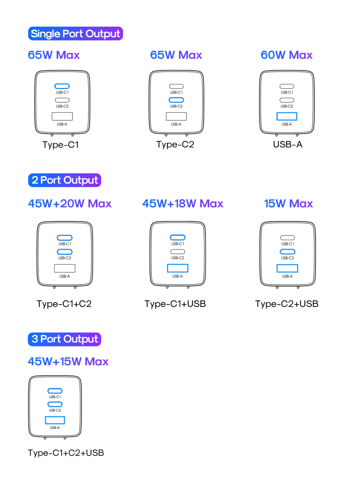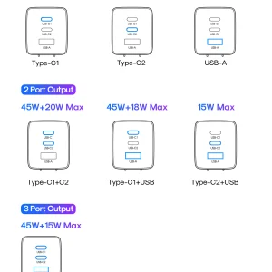 - USB-C1 + C2 + USB-A: 45W + 15W (Max)