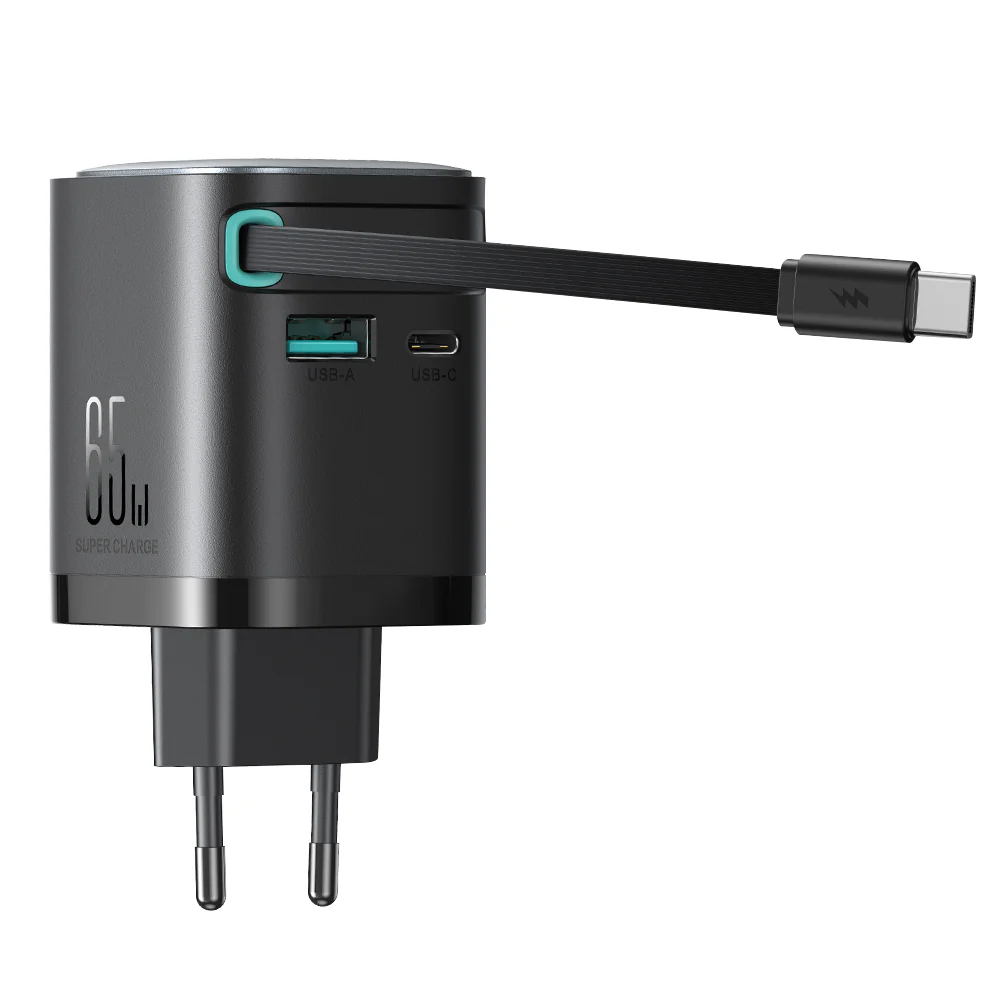 • Built-in Retractable Cable: 65W self-coiling USB-C cable — extends when needed and retracts neatly when not in use.